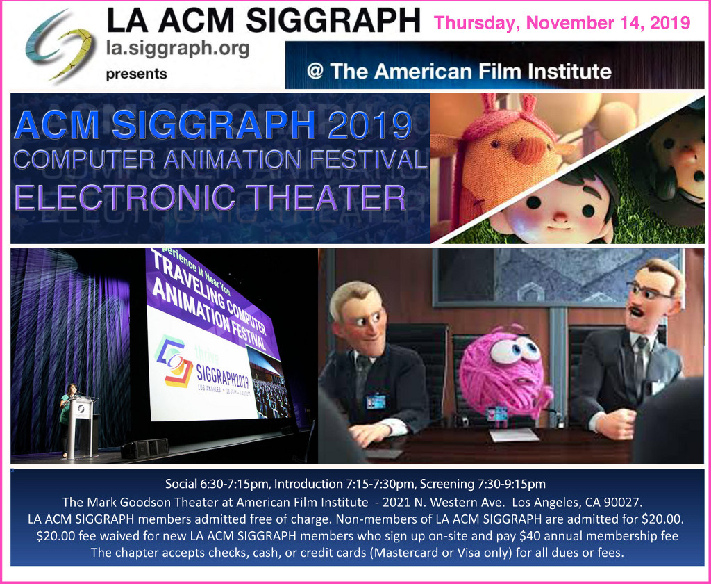Join US at the digital 'fireplace' of the world’s best CG animated shorts… and more! LA SIGGRAPH will present this additional screening of this year's 2019 COMPUTER ANIMATION FESTIVAL ELECTRONIC THEATER Show. It will includes trailers from the Technical Papers program as well as a teaser from the VR Theater and the "Generations" retro compilation video.
