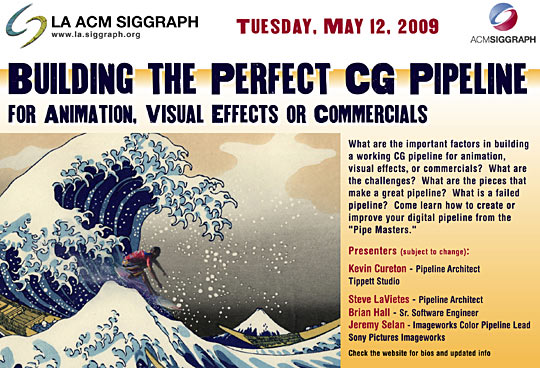 What are the important factors in building a working CG pipeline for animation, visual effects, or commercials? What are the challenges? What are the pieces that make a great pipeline? What is a failed pipeline? Come learn how to create or improve your digital pipeline from the "Pipe Masters."