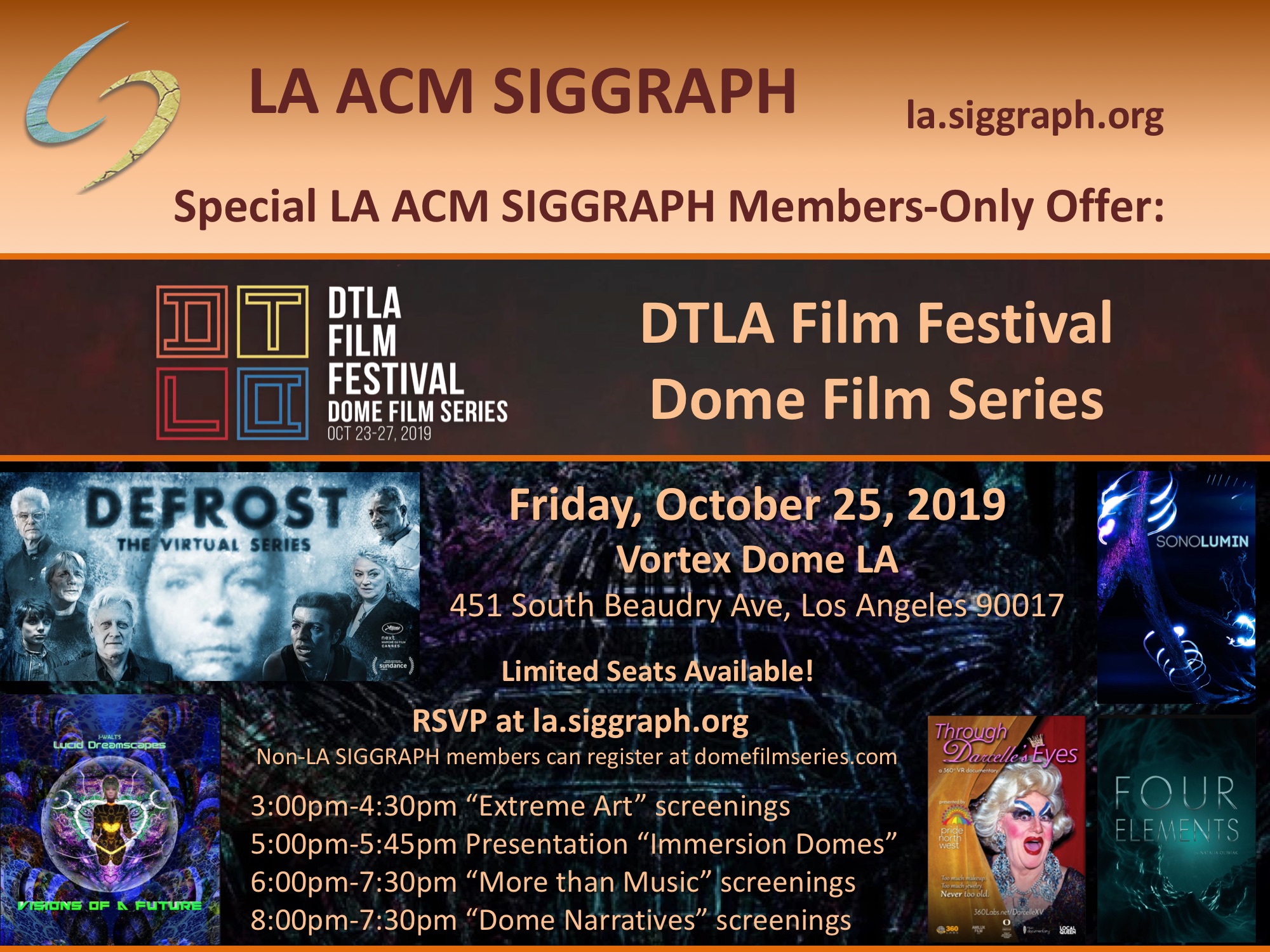 Limited seating – RSVP required. LA ACM SIGGRAPH Chapter members who RSVP will be admitted free of charge. New LA ACM SIGGRAPH members who sign up on-site and pay the $40 annual membership fee will be admitted free if on RSVP list. The chapter accepts checks, cash, or credit cards (Mastercard or Visa only) for all dues or fees. Non-members of LA ACM SIGGRAPH may register on the Dome Film Series (.com) site.