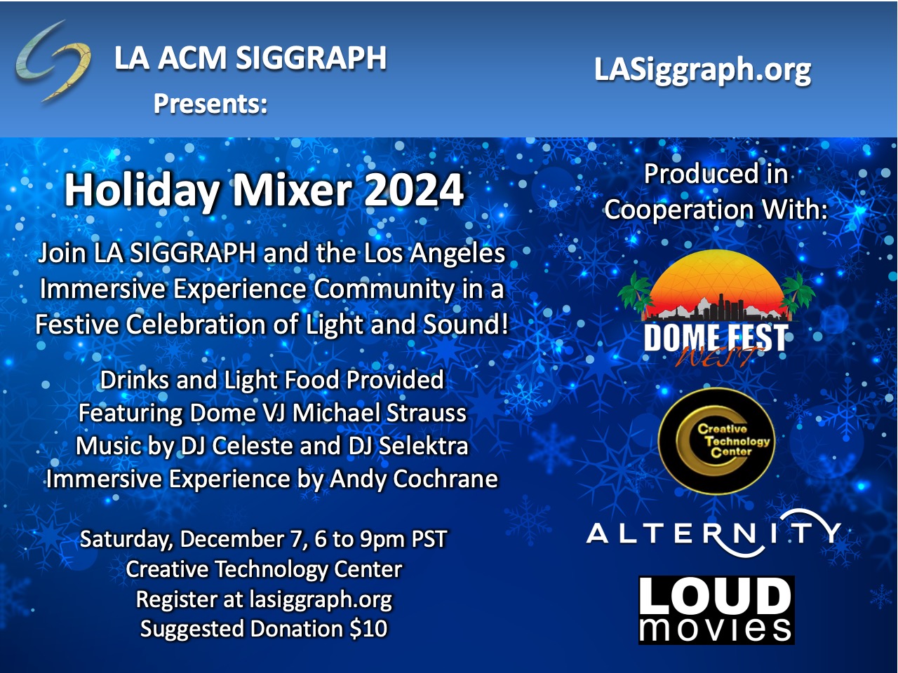 LA SIGGRAPH and Dome Fest West invite you to a festive Holiday Mixer at the Creative Technology Center in Downtown Los Angeles.