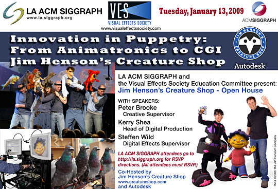 Claudia Sumner, Leonard Daly, Sheri Ki Sun Burnham, Diana Lee, Kathleen Milnes, Diane Piepol, the Executive Council and all the LA ACM SIGGRAPH Volunteers. Melissa Sherman (VES), Toni Pace Carstenson (VES) Kerry Shea, Donny Kennedy and all the staff at The Jim Henson Company Reservations for this event have been closed. We are sorry we are unable to accomidate you for this event. Please come to our February event. Details will be announced on the web site.