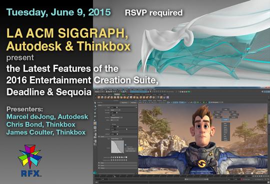 Please join Los Angeles ACM SIGGRAPH, Autodesk, & Thinkbox on Tuesday, June 9th for a meetup at Gnomon in Hollywood. Marcel deJong of Autodesk will be showing off the latest features of the 2016 Entertainment Creation Suite. And, Chris Bond and James Coulter of Thinkbox will be demonstrating Deadline and Sequoia. Seats are limited, so be sure to RSVP!