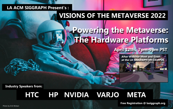 Join Host/Moderator Larry Rosenthal, Vice Chair of LA Siggraph as they welcome Industry Leaders from the Companies that are creating, building and selling the tools for the Metaverse. April's webinar will focus on the Hardware systems and May's webinar will focus on the Software and tool Platforms. Both Webinars will be presented via Zoom and have a Live VR Meet and Greet afterwards online in the LA SIGGRAPH VR Campus.
